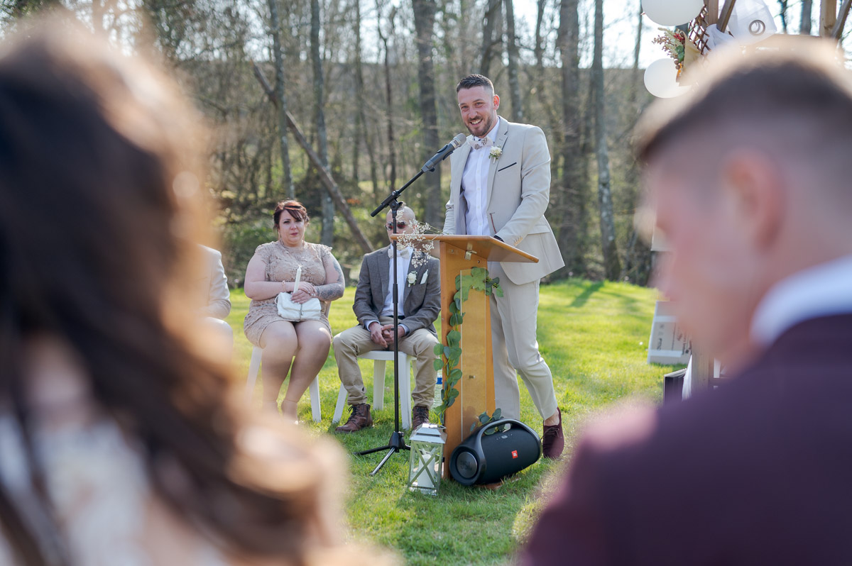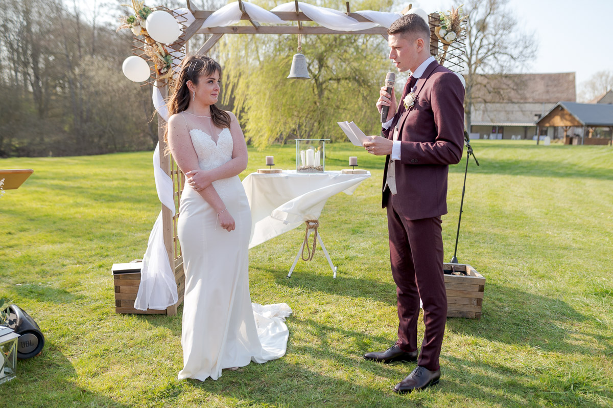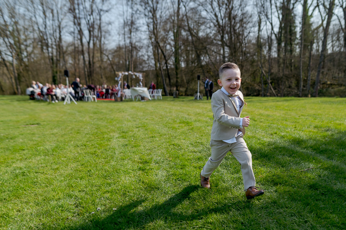 Ce site est en pleine nature et il a un atout particulier il est très vaste avec un grand étang, et nous pouvons y pratiquer le hors bord, d’ailleurs le marié va accéder à la cérémonie laïque depuis la berge avec une traversée avec le bateau.