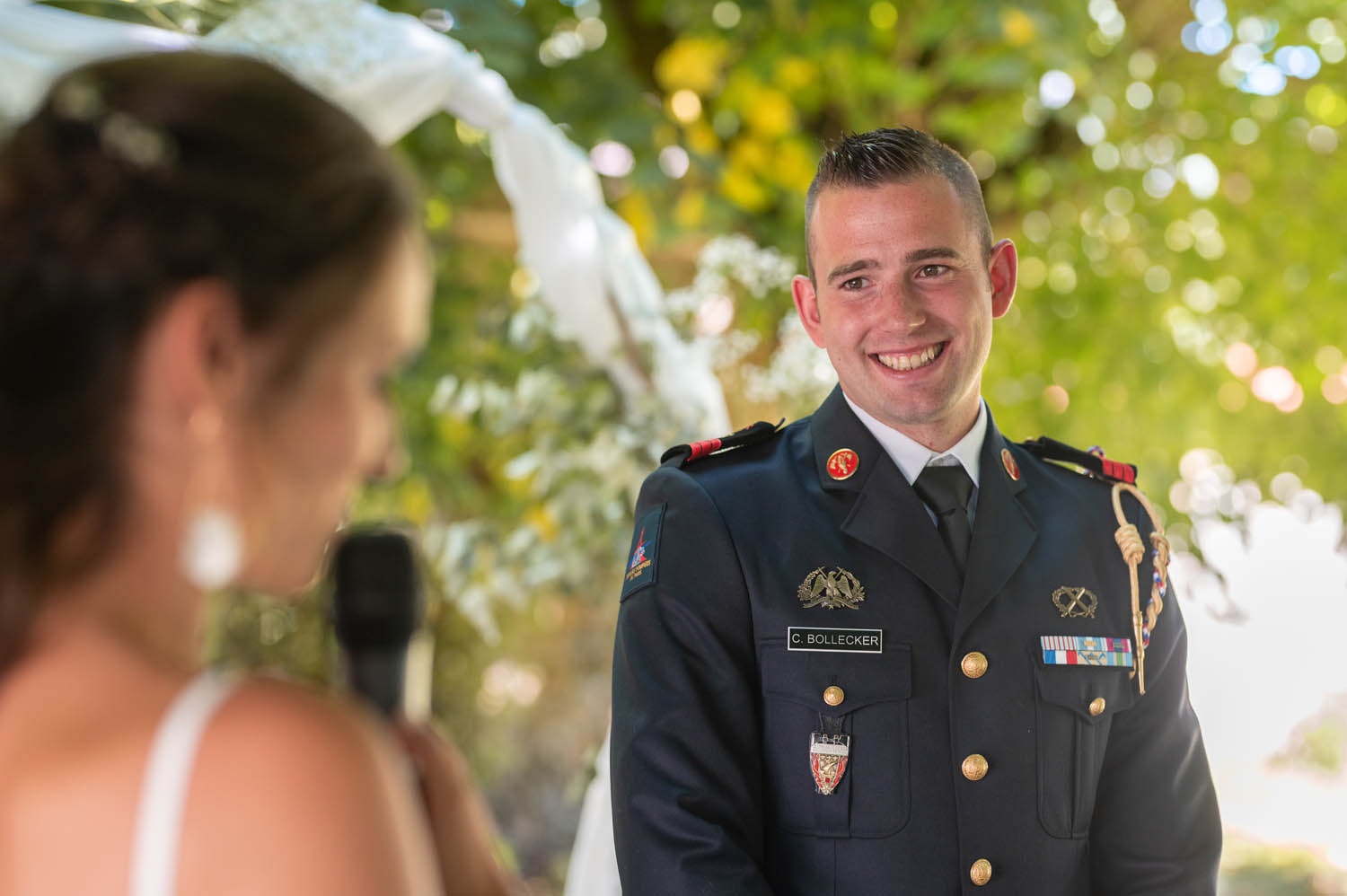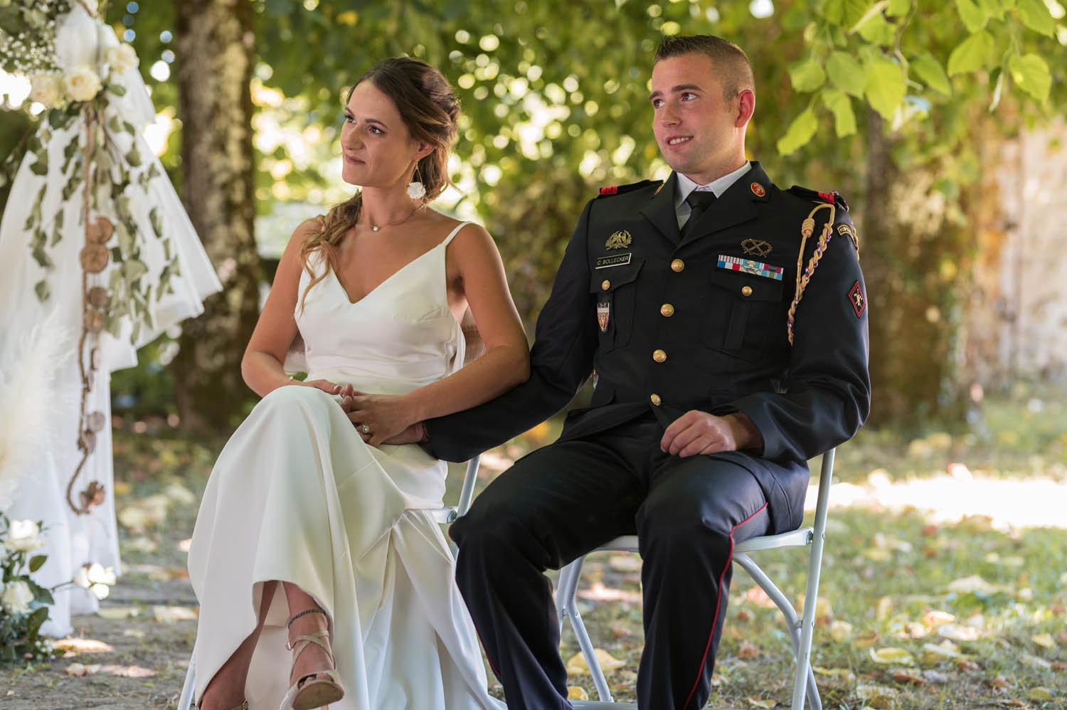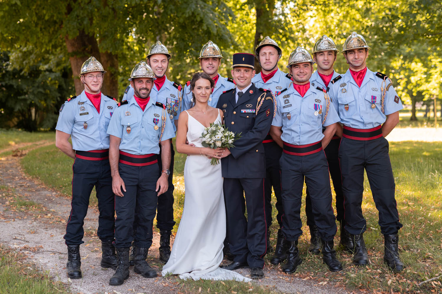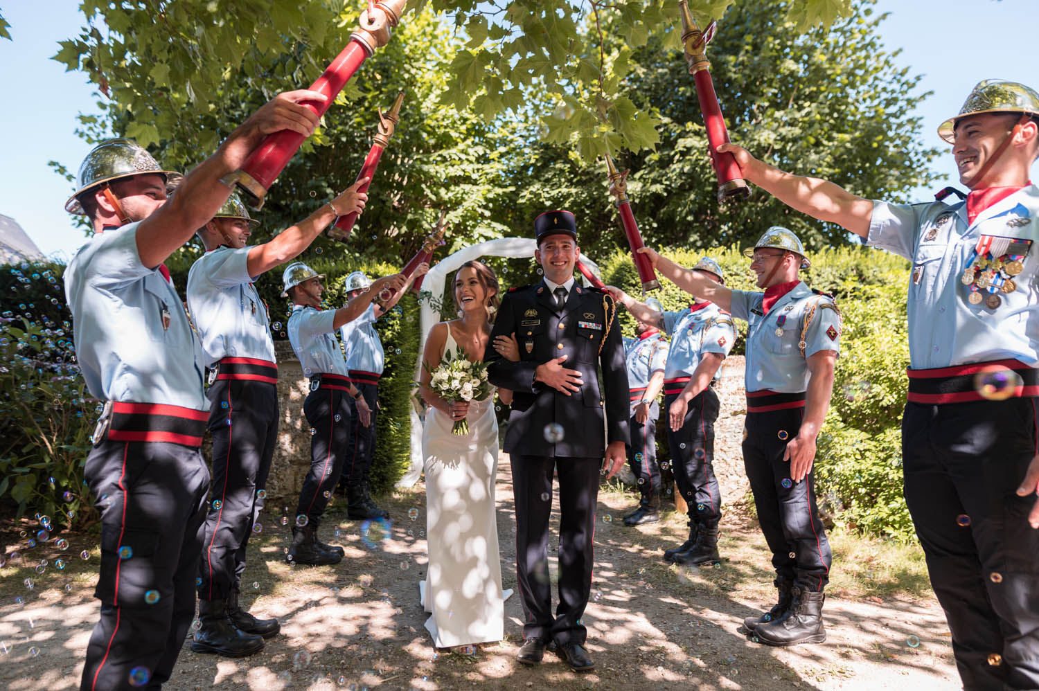 Le temps est parfait aujourd’hui, un peu plus frais que les jours précédents, mais toujours ensoleillé et agréable. Le couple a choisi le domaine de la Frossardière pour leur cérémonie de mariage, un château somptueux et prestigieux qui appartient aux Pompiers de Paris. Cedric est en effet pompier, et la cérémonie laïque sera ponctuée par une haie d’honneur de ses collègues avec leurs lances.