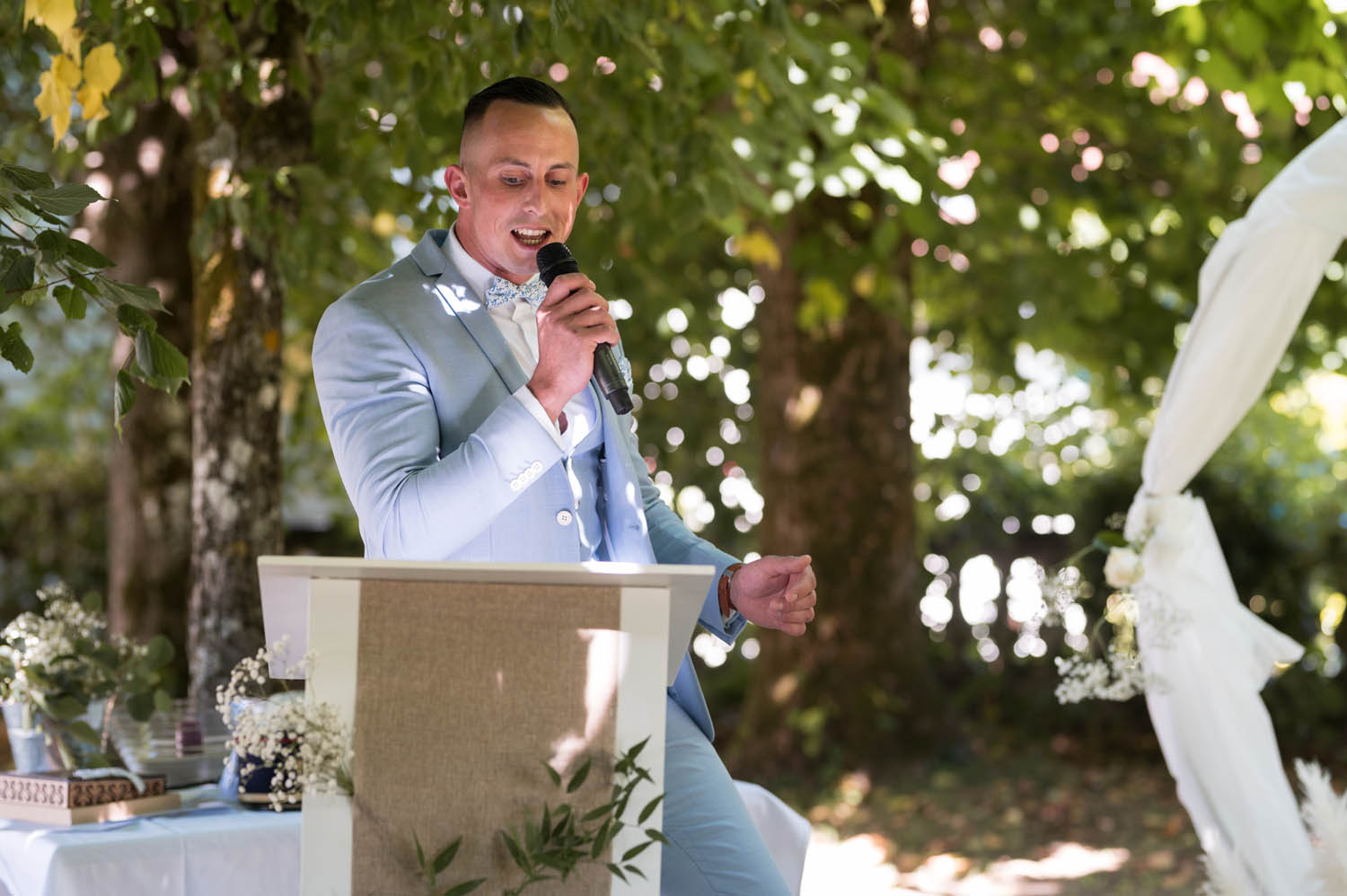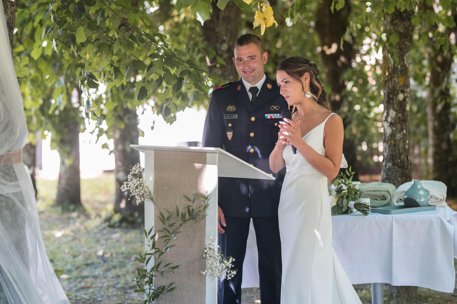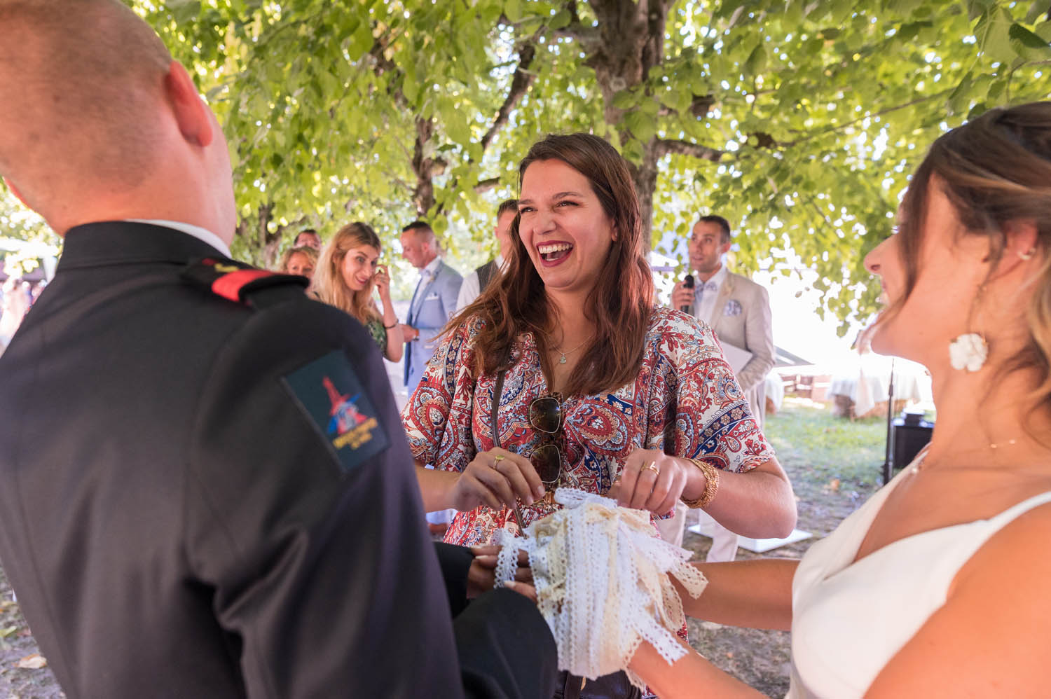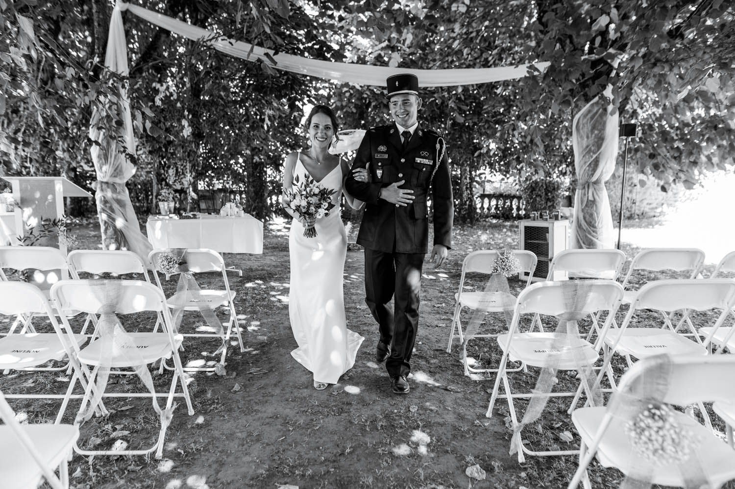 Le temps est parfait aujourd’hui, un peu plus frais que les jours précédents, mais toujours ensoleillé et agréable. Le couple a choisi le domaine de la Frossardière pour leur cérémonie de mariage, un château somptueux et prestigieux qui appartient aux Pompiers de Paris. Cedric est en effet pompier, et la cérémonie laïque sera ponctuée par une haie d’honneur de ses collègues avec leurs lances.