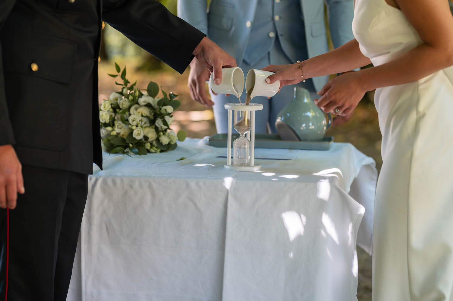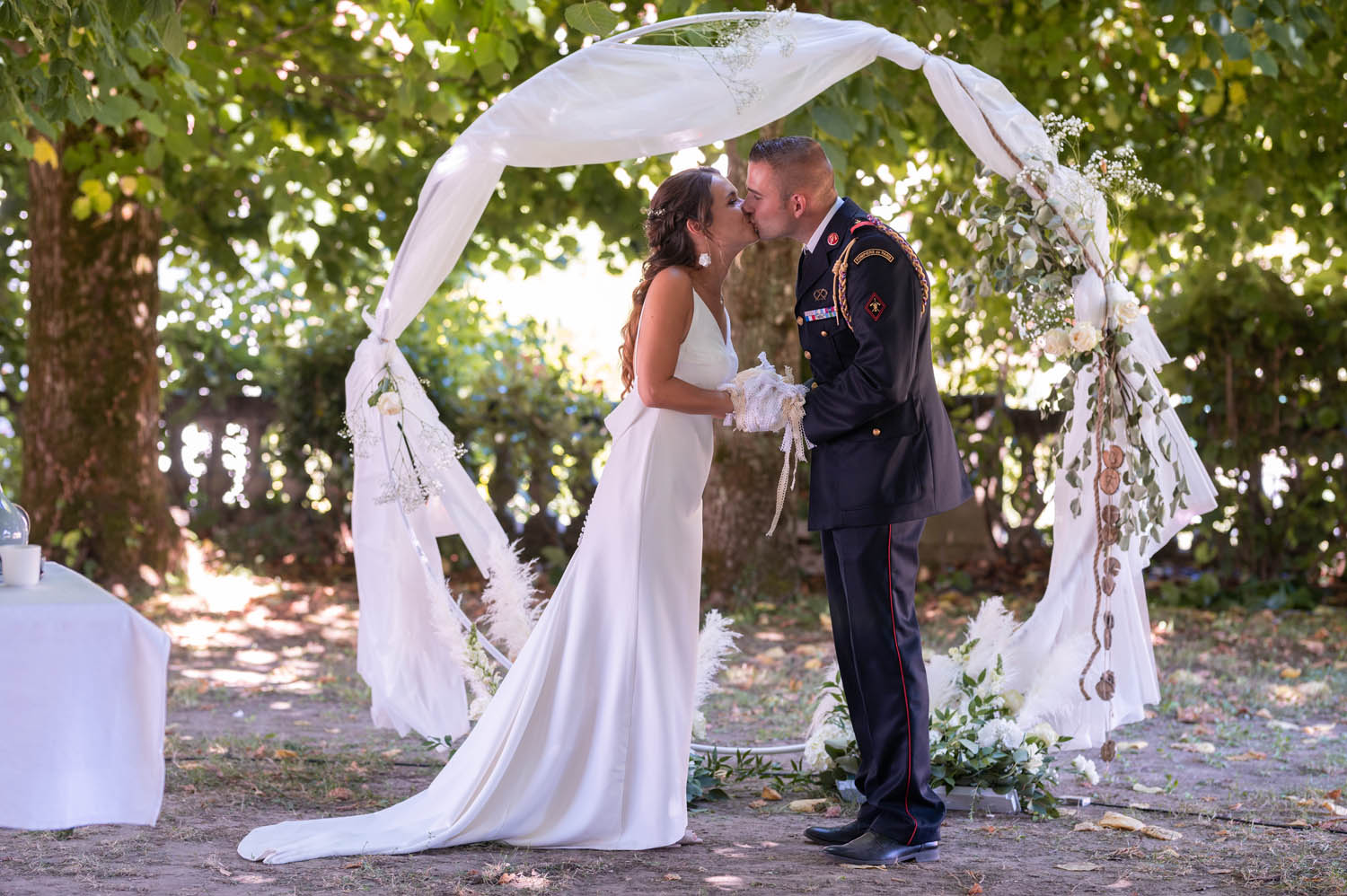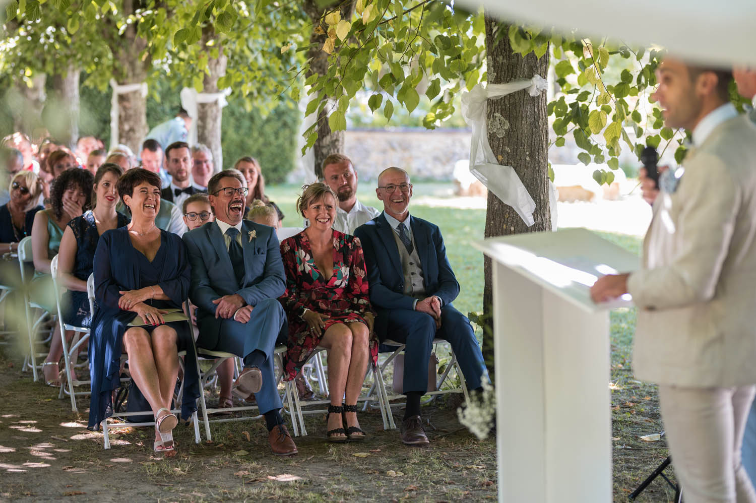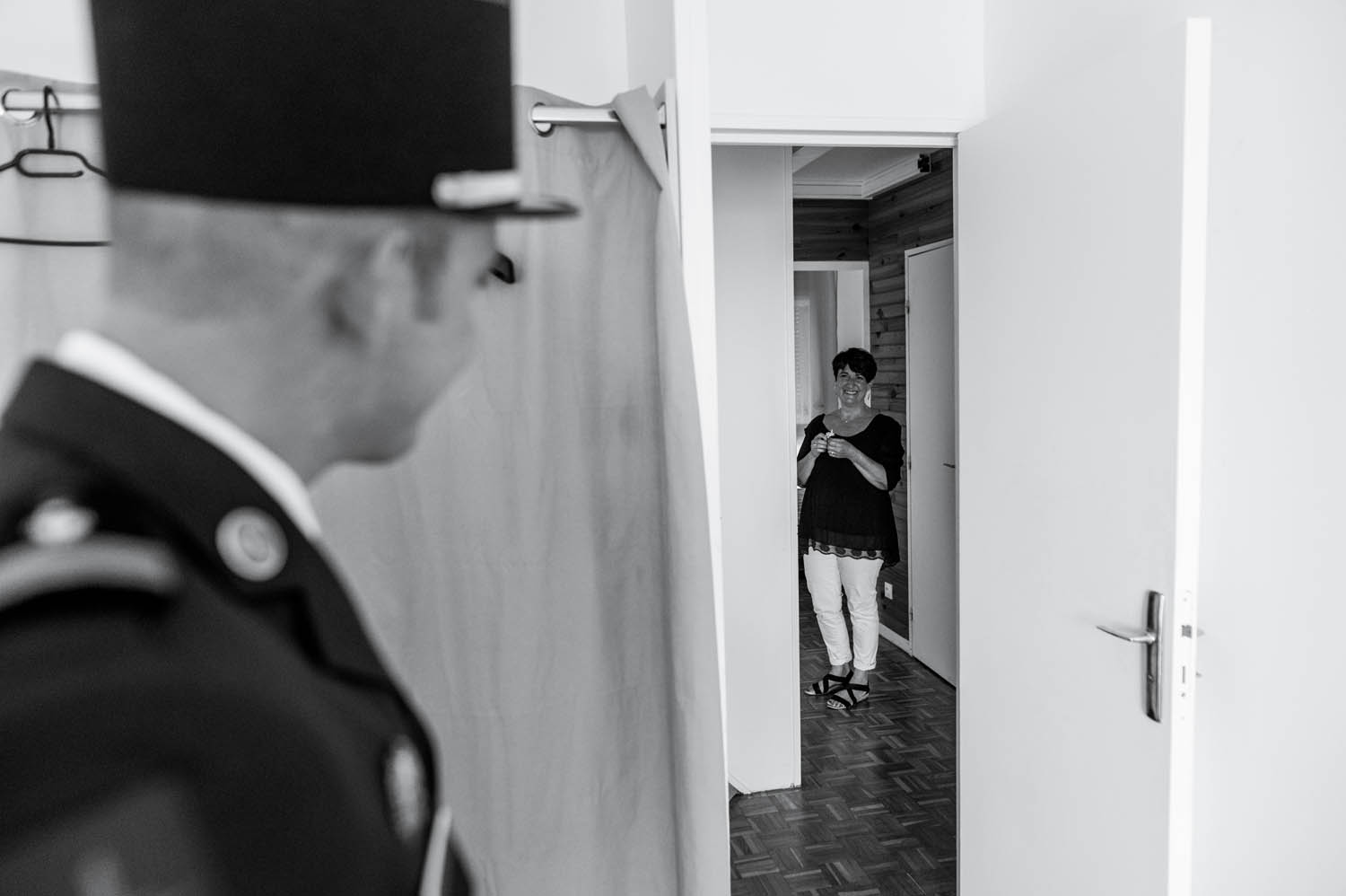 Le temps est parfait aujourd’hui, un peu plus frais que les jours précédents, mais toujours ensoleillé et agréable. Le couple a choisi le domaine de la Frossardière pour leur cérémonie de mariage, un château somptueux et prestigieux qui appartient aux Pompiers de Paris. Cedric est en effet pompier, et la cérémonie laïque sera ponctuée par une haie d’honneur de ses collègues avec leurs lances.