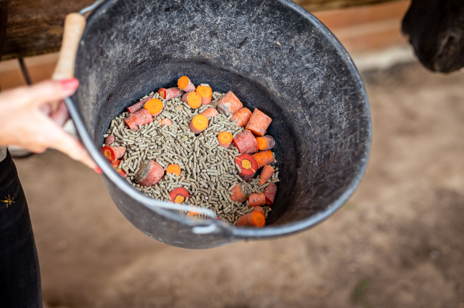 Elle lui montre mon fourre-tout photo et un autre sac, la jument observe mon équipement.